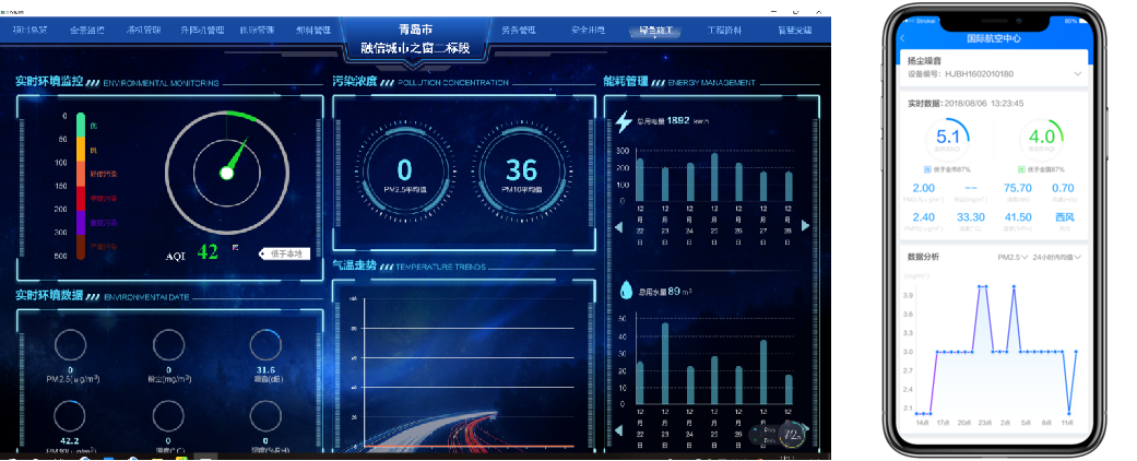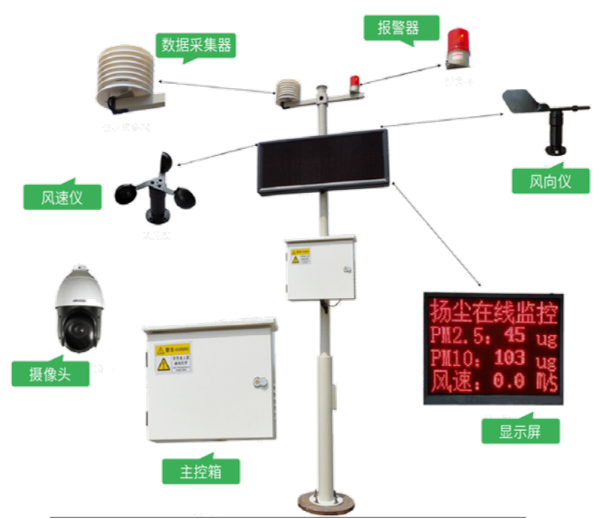 中电智慧工地扬尘监测设备可实时监测,颗粒物(PM2.5/PM10)、温湿度、噪音、风速、风向等环境指标。