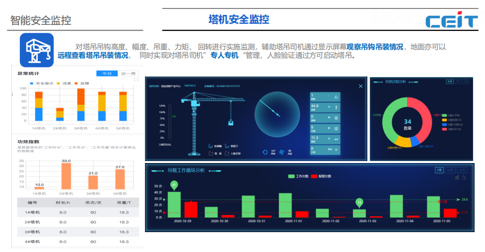 近年来,建筑工地塔机事故屡屡发生,不仅造成人员伤亡,而且造成巨大的经济损失。中电智慧工地塔式起重机吊钩视觉安全管理系统,360度无死角自动聚焦跟踪吊钩操作屏幕,有效防止危险情况。过去,起重机起重机驾驶员的起吊材料需要通过对讲机和命令进行反复的协调和沟通并进行操作。即使这样,由于塔式起重机的极高的提升距离和视线的盲点,塔式起重机的吊钩经常不准确或吊钩脱落,导致材料散落和安全事故。中电智慧工地塔机监控系统监控塔机的运行安全指标,包括起重,起重扭矩,振幅,高度,工作回转角和工作高度风速,并在接近额定极限时发出听觉和视觉警告和警报实现塔式起重机危险操作的自动切断。 当发生过载,过载等危险情况时,中电智慧工地塔机监控系统可以自动切断危险行为,使塔机向安全运行方向发展,并阻止塔机向危险运行方向移动。